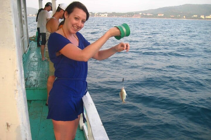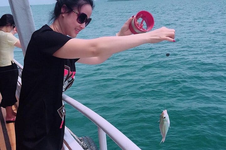 The boat tour goes to Xuong/Gam Ghi Island for snorkeling/swimming, then includes lunch and relaxation on May Rut Trong Island.